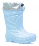 Водонепроницаемые сапожки для девочки небесно-голубого цвета с тёплым вкладным чулком подходят как для летней ненастной погоды, так и для демисезона. - Сапожки сделаны из ЭВА (этиленвинилацетат) - невероятно легкого и амортизирующего материала, не скользящего и не натирающего ноги. - Текстильный чулок с содержанием хлопка 80% укомплектован тёплой войлочной стелькой. Ноги ребенка будут \'дышать\' и, в то же время, находиться в тепле. - Манжет с красивым принтом надёжно затягивается на голенище с помощью резинки с фиксатором, что предотвращает попадание влаги через верх сапога внутрь.